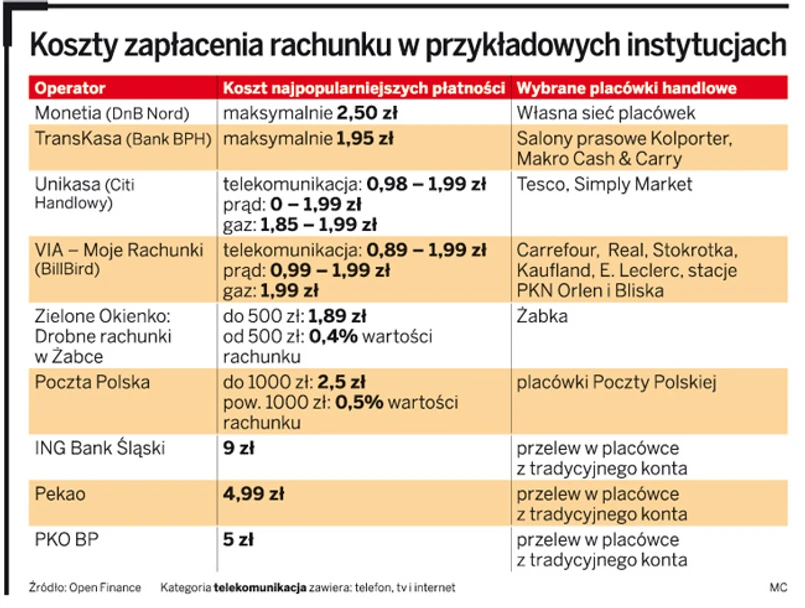 Faktury za media można więc opłacać np. w sklepach Żabki. W sklepach Tesco i Simply Market znajdują się placówki Unikasy, które także dają taką możliwość. W salonikach Kolpoltera i hipermarketach Makro Cash & Carry są natomiast oddziały TransKasy. Za pośrednictwem punktów Via Moje Rachunki można opłacać faktury w sklepach Carrefour, Real, Stokrotka, Kaufland, E. Leclerc i na stacjach PKN Orlen. Coraz częściej jest to też możliwe w małych sklepach osiedlowych, których właściciele stali się przedstawicielami tych lub podobnych firm. Prowizja za opłacenie rachunku w placówkach handlowo-usługowych nie przekracza zwykle 2 zł. Jednorazowy koszt opłacenia rachunku waha się od 0,85 do 1,99 zł. Zdarzają się też promocje.