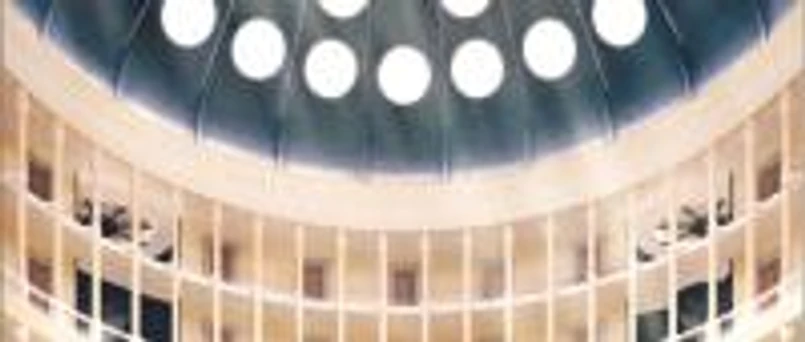Centralne miejsce budynku wypełnia patio, wewnętrzny dziedziniec przykryty futurystyczną kopułą.