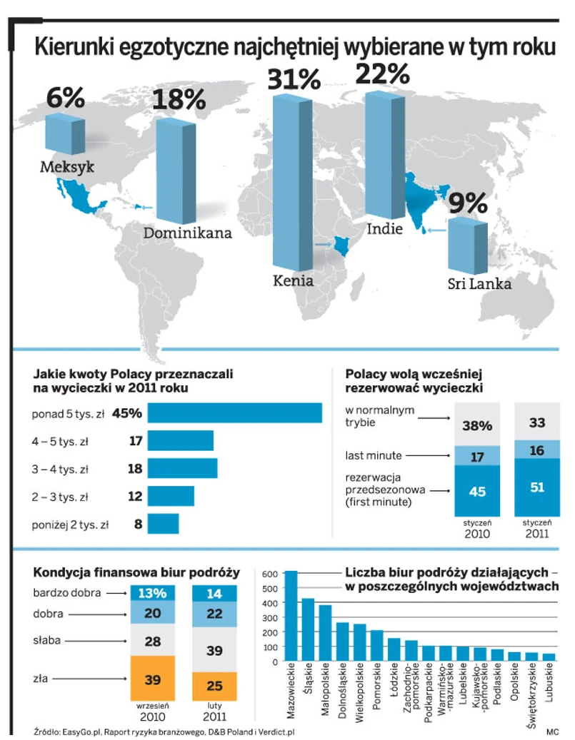 W tym roku biura podróży nie zwiększyły swoich programów w obawie przed kolejnym kryzysem na rynku. W sumie oferta obejmuje ok. 3 mln osób, natomiast liczba chętnych zwiększyła się o mniej więcej 10 – 15 proc. – Sprzedaliśmy już 90 proc. wycieczek na maj i czerwiec na nowych kierunkach – mówi Piotr Czorniej.