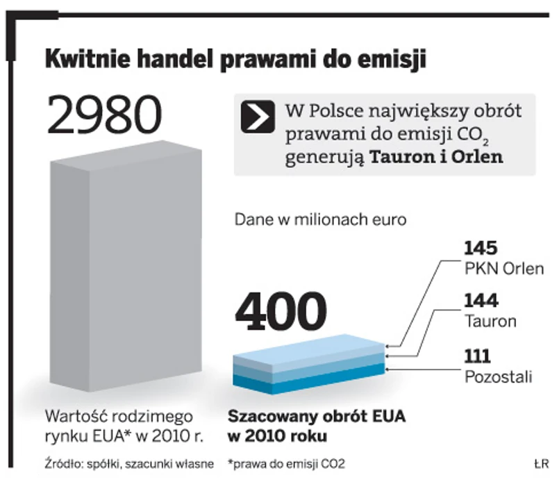 Tylko Orlen i Tauron w 2010 roku sprzedały i kupiły EUA za niemal 290 mln euro. Energetyczny koncern w tym czasie obrócił ponad 10 mln uprawnień EUA (każda jednostka EUA odpowiada jednej tonie CO2). Oznacza to, że wartość tych transakcji przekroczyła 144 mln euro. Spółka handlowała za pośrednictwem międzynarodowych giełd energii i na podstawie umów dwustronnych. Magdalena Rusinek z Tauronu nie zdradza jednak, z kim zawarto kontrakty. Wyjaśnia, że chodzi zarówno o podmioty krajowe, jak i zagraniczne.