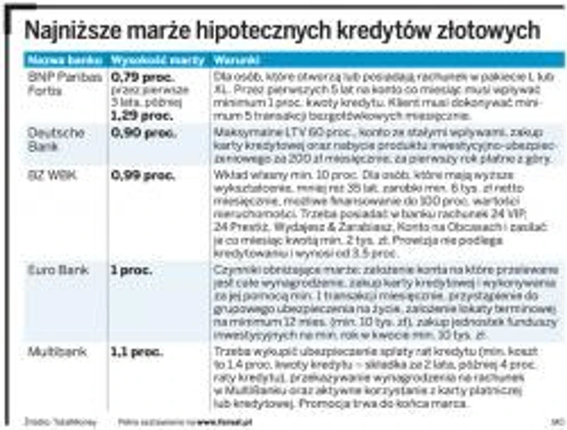 Marżą w wysokości 0,9 proc. chwali się Deutsche Bank. W tym przypadku kredytobiorca musi mieć w gotowce minimum 40 proc. pieniędzy na kupno nieruchomości. Powinien też założyć w banku konto, na które będzie wpływało jego wynagrodzenie, kupić kartę kredytową i wyłożyć 2,4 tys. zł na program inwestycyjny.