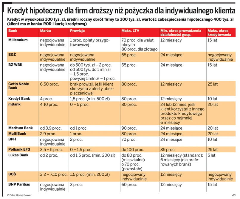 Za tę dowolność trzeba jednak słono zapłacić. Nie tylko niemal regułą jest prowizja w wysokości 1 – 2 proc. kwoty kredytu, to jeszcze przedsiębiorca musi się liczyć z wysoką marżą. O ile średnia marża dla klientów indywidualnych wynosi obecnie 1,8 proc., to przy kredytach hipotecznych dla firm średnia przekracza 3 proc., a bywa nawet większa niż 5 proc. Gdy doda się do tego WIBOR 3M (4,15 proc.), oprocentowanie kredytów dla firm, który jest zabezpieczony hipoteką, wynosi ok. 10 proc.
