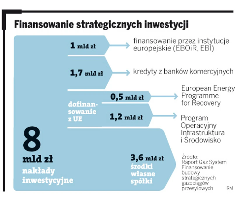 Reszta funduszy będzie pochodzić ze środków własnych Gaz-Systemu (3,6 mld zł), dofinansowania unijnego (1,7 mld zł) oraz pożyczek z Europejskiego Banku Odbudowy i Rozwoju oraz Europejskiego Banku Inwestycyjnego.