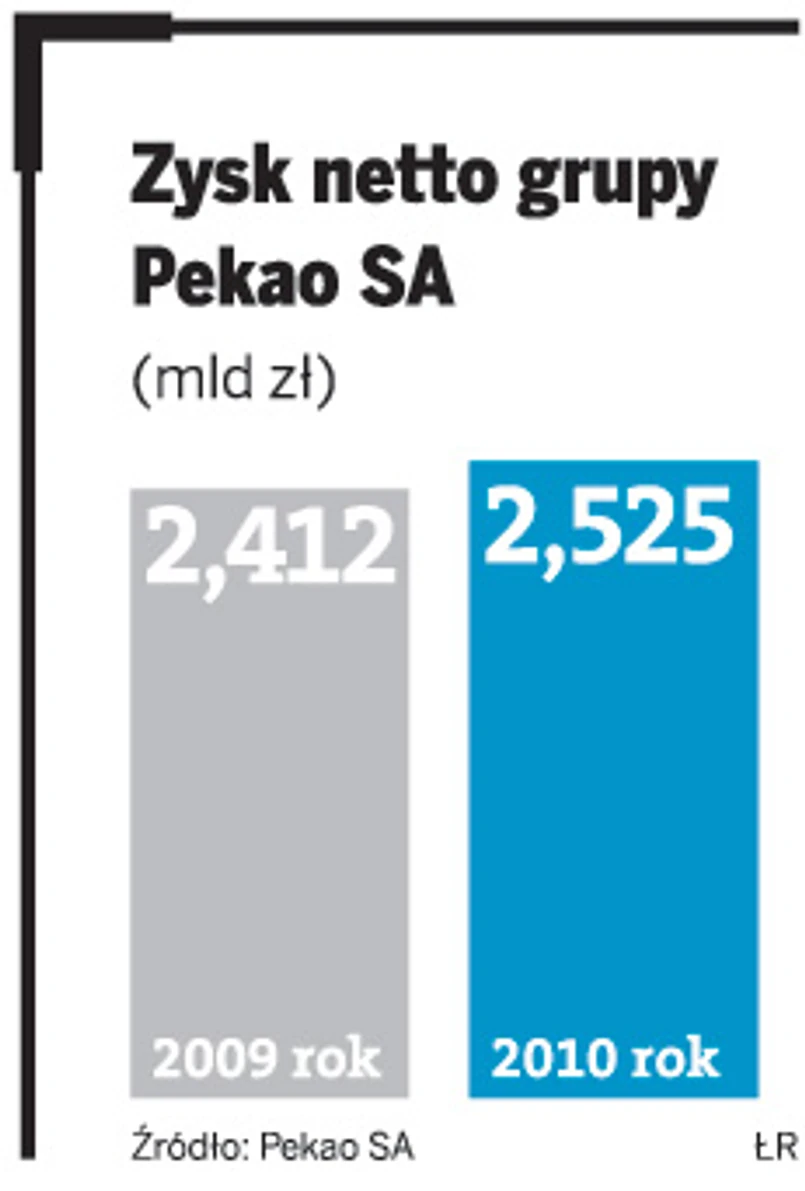 Zysk banku Pekao SA wzrósł w 2010 r. o 4,7 proc., do ponad 2,5 mld zł. Zarząd Pekao SA będzie rekomendował wypłatę dywidendy w wysokości 6,8 zł na akcję.