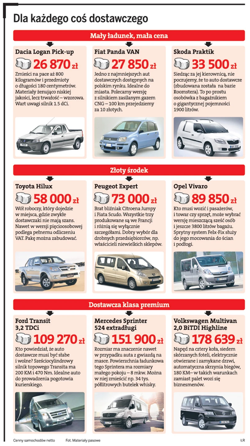 Na drugim końcu skali parkują prawdziwe dostawcze potwory, których ceny potrafią zbliżyć się do 200 tys. złotych. Pod względem komfortu, bezpieczeństwa, a nawet osiągów nie odbiegają one od aut osobowych. Ford Transit w topowej wersji 3,2 TDCi ma 200 koni mechanicznych i załadowany przyspiesza do setki szybciej niż niejedno auto kompaktowe. Do Mercedesa Sprintera można zamówić nawet kurtyny powietrzne, kamerę cofania, skórzaną tapicerkę czy reflektory biksenonowe. W Volkswagenie Multivanie dostępny jest za dopłatą specjalny elektroniczny asystent podpowiadający, kiedy można bezpiecznie zmienić pas ruchu. Normą, nawet w najtańszych modelach, stały się czołowe poduszki powietrzne oraz system ABS.