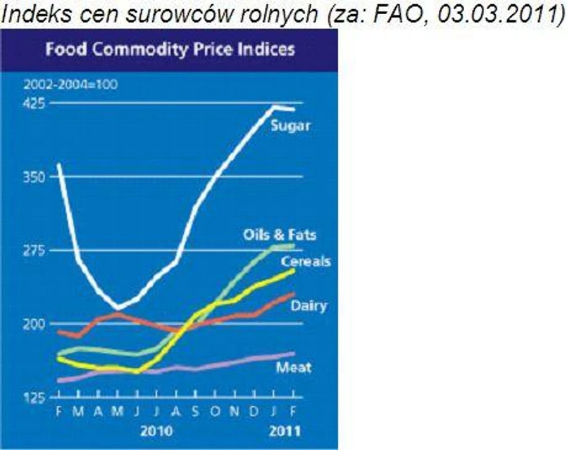 Jednocześnie seria niekorzystnych zjawisk pogodowych (m.in. w Argentynie i południowej Brazylii) znacznie obniżyła plony. Według najnowszych prognoz pod koniec bieżącego sezonu zapasy kukurydzy spadną do krytycznie niskiego poziomu. Susza, która nawiedziła latem 2009 r. Rosję i Ukrainę, dwóch głównych eksporterów pszenicy, spowodowała wyraźny wzrost cen tego zboża, które są jednak nadal niższe niż w roku 2008. Te wzrosty cen wynikają również z decyzji niektórych krajów o ograniczeniu lub zamknięciu eksportu, co na ubogich w pszenicę rynkach wywołało strach przed niedoborami i skłoniło kraje, które swoje bezpieczeństwo żywnościowe opierają w dużej mierze na produktach importowanych, do panicznych zakupów. Na wzrost cen wpływ mają również deprecjacja dolara i spekulacje finansowe.