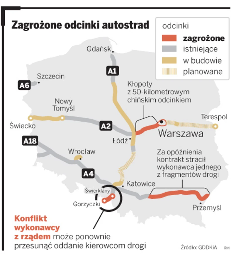 Generalna Dyrekcja Dróg Krajowych i Autostrad jest także w prawnym konflikcie z wykonawcą 21-kilometrowego odcinka autostrady A4, polsko-macedońskim konsorcjum NDI i SB Granit. Chęć przerwania prac wykonawca tłumaczył zaległościami finansowymi ze strony dyrekcji, choć przyznawał się jednocześnie do opóźnień w realizacji inwestycji. Tłumaczył je jednak przyczynami obiektywnymi: powodzią oraz pracami archeologicznymi. Dyrekcja zareagowała rozwiązaniem kontraktu z winy wykonawcy ze względu na wielomiesięczne opóźnienia i nałożeniem 62 mln kary. Przedstawiciele konsorcjum zapowiedzieli, że skierują sprawę do sądu, aby rozstrzygnął ostatecznie spór. Proces jeszcze się nie rozpoczął, ale oczywiste jest, że odcinek autostrady (wart 620 mln zł) nie będzie gotowy w terminie, czyli na początku 2012 roku.