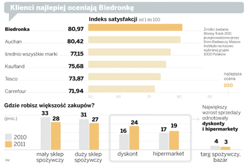 Na kolejnych miejscach znalazły się Auchan (80,42 pkt) oraz Kaufland (75,68 pkt). Badanie zrealizowano jeszcze przed sporem o Biedronkę Jarosława Kaczyńskiego i Donalda Tuska.