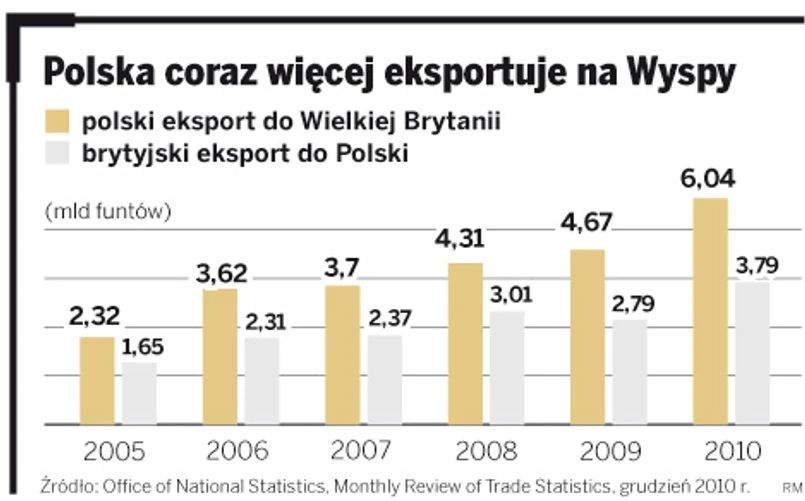 Polska ma większą nadwyżkę handlową z Wielką Brytanią niż z jakimkolwiek innym partnerem handlowym na świecie. W zeszłym roku największy wzrost wartości eksportu polskiego odnotowano w branżach komputerowej (o 89 proc. więcej niż w 2009 r.), motoryzacyjnej (wzrost o 68 proc.) i farmaceutycznej (o 45 proc. więcej wyeksportowanych leków).