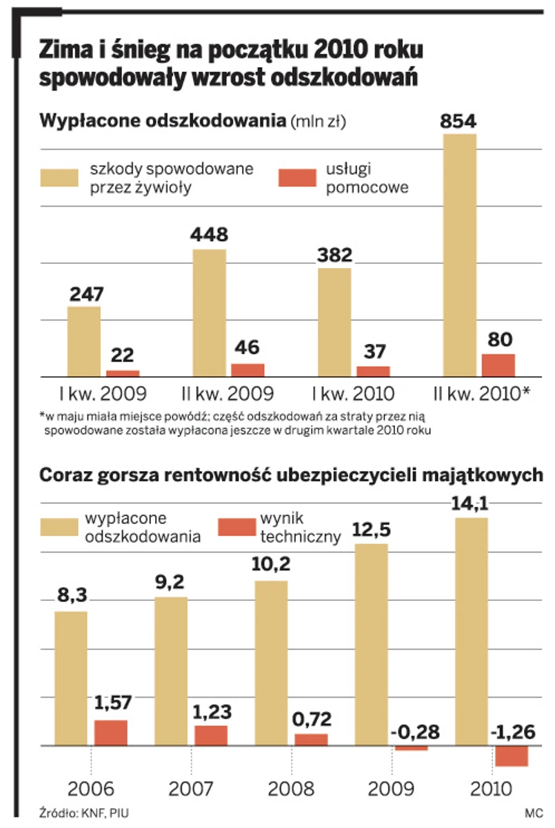 Z danych Polskiej Izby Ubezpieczeń wynika, że wartość odszkodowań wypłaconych w 2010 roku z tytułu ubezpieczeń majątkowych wyniosła 14,1 mld zł i była o 13,5 proc. wyższa niż rok wcześniej. Główną przyczyną wzrostu wypłat były szkody związane z żywiołami. Na ten cel poszło 2,35 mld zł, czyli o 95 proc. więcej niż w 2009 roku.