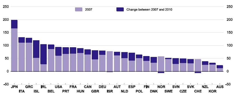 Rekordzistą jest Japonia, gdzie dług publiczny sięga 200 proc. PKB. Włochy i Grecja idą prawie łeb w łeb zbliżając się do 140 proc. PKB. Wydatki ponad stan stały się udziałem zdecydowanej większości krajów OECD. Nawet USA stanowiące dla wielu ekonomiczny punkt odniesienia przebiły próg 100 proc. PKB, plasując się na siódmym miejscu wśród najbardziej zadłużonych członków klubu najbogatszych gospodarek świata i najbardziej rozwiniętych gospodarek wschodzących.