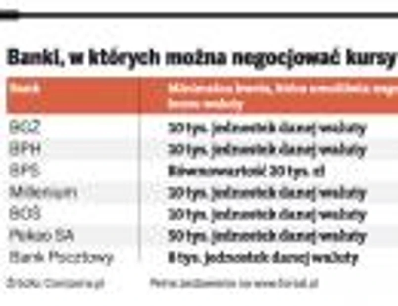 Najczęściej minimalny poziom pozwalający negocjować kurs to 5 – 10 tys. euro, franków lub dolarów. Bankowcy nie chcą otwarcie mówić o wysokości rabatów, jakie można wynegocjować podczas tych indywidualnych rozmów.