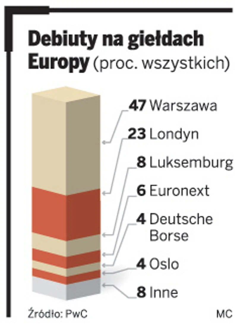 Łącznie 45 debiutów na obu rynkach miało wartość ponad 121 mln euro. Warszawska giełda nie miała sobie równych pod względem liczby debiutów. W całej Europie było ich 95, a więc w Warszawie odbyła się prawie połowa z nich. Ale pod względem wartości przeprowadzonych ofert daleko nam do Londynu. Na tamtejszej giełdzie wartość 25 debiutów wyniosła niemal 2 mld euro. Pod tym względem nasz parkiet ustępuje także giełdom w Oslo, we Frankfurcie i w Mediolanie.