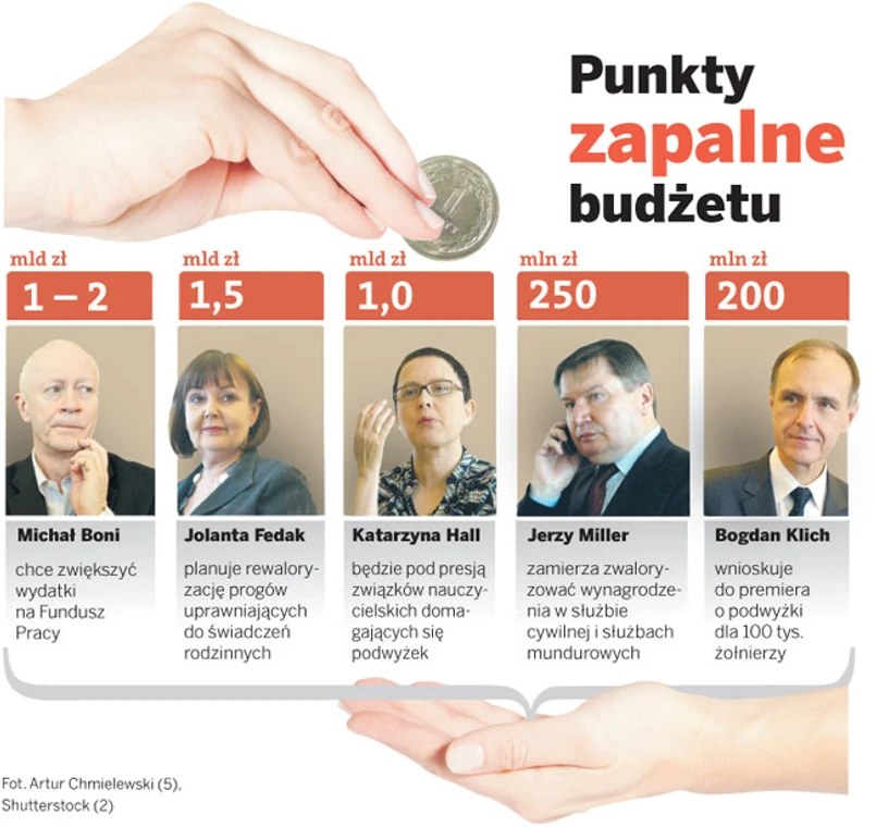 Zapowiada się też niezwykły sojusz Michała Boniego i Jolanty Fedak, których dzielił dotąd spór o OFE. Chcą oni zwiększyć wydatki Funduszu Pracy na aktywizację bezrobotnych ścięte w tym roku z 7 mld zł do 3 mld zł. A to, jak mówił wczoraj Michał Boni, spowoduje wzrost długotrwałego bezrobocia.