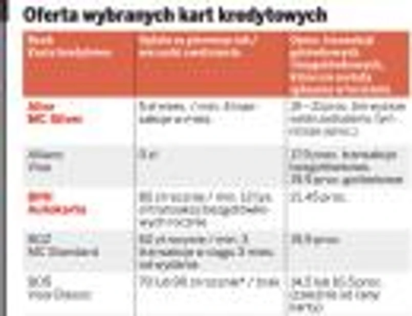 ● Oprocentowanie Odsetki od kredytu w karcie są często najwyższe, jakie dopuszcza polskie prawo. Są jednak banki, które nie stosują się do maksymalnej granicy. W Millennium przez pierwsze 3 miesiące naliczane są odsetki w wysokości 9,9 proc. (później 20 proc.). W Pekao w pierwszym roku oprocentowanie wynosi 12,99 proc. (później rośnie do 21 proc.). W BOŚ oprocentowanie na karcie wynosi 14,5 lub 16,5 proc. (niższe przy droższej karcie).