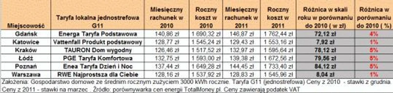 Portal TotalMoney.pl przeprowadził analizę kosztów energii dla gospodarstw domowych ze średnim rocznym zużyciem 3000 kWh w wybranych lokalizacjach. Za podstawę porównania posłużyły cenniki dla taryfy G11 (jednostrefowej) obowiązujące w grudniu 2010 oraz w marcu 2011, czyli po noworocznych podwyżkach. Wyniki przedstawia tabela.