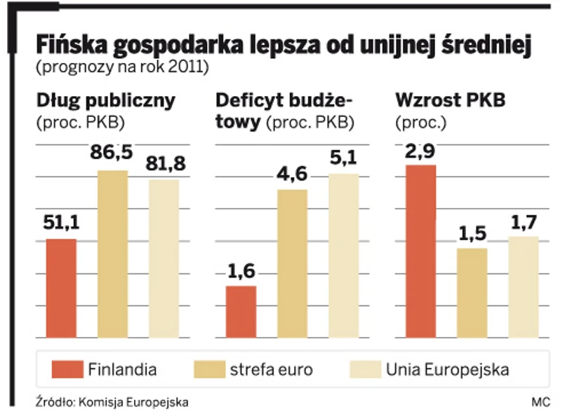 Fiński kryzys był efektem załamania się eksportu na wschód po upadku Związku Radzieckiego, na co jeszcze się nałożyły problemy sektora bankowego. W efekcie w maju 1994 r. bezrobocie osiągnęło 19,9 proc. Dziś Finlandia – nawet mimo załamania spowodowanego światowym kryzysem 2008 – 2009 – jest jedną z niewielu zdrowych gospodarek Unii. Jako jedyna obok niewielkiego Luksemburga nie przekracza limitów deficytu budżetowego i długu publicznego. Jest także jednym z sześciu państw, które mają maksymalny rating wiarygodności kredytowej – AAA.