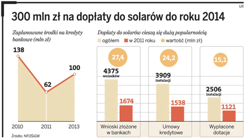 Narodowy Fundusz Ochrony Środowiska i Gospodarki Wodnej przeznaczył 300 mln zł na dopłaty do kredytów bankowych na budowę i montaż kolektorów słonecznych do ogrzewania wody. W ubiegłym roku wśród sześciu banków rozdysponował z tej kwoty 138 mln zł. W tym roku planuje wypuścić na rynek kolejne środki.