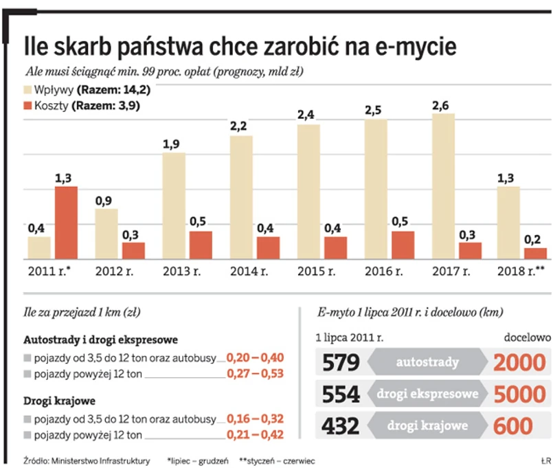 Tymczasem nadzór jest niezbędny do zapewnienia zakładanej 99-proc. skuteczności w egzekwowaniu naliczonych opłat. Bez tego z systemu wyciekną miliony. Generalna Dyrekcja Dróg Krajowych i Autostrad liczy, że tegoroczne wpływy z e-myta sięgną 402 mln zł, a za rok przekroczą 900 mln zł. Do połowy 2018 r. opłaty za przejazdy ciężarówek mają wynieść w sumie 14,2 mld zł.
