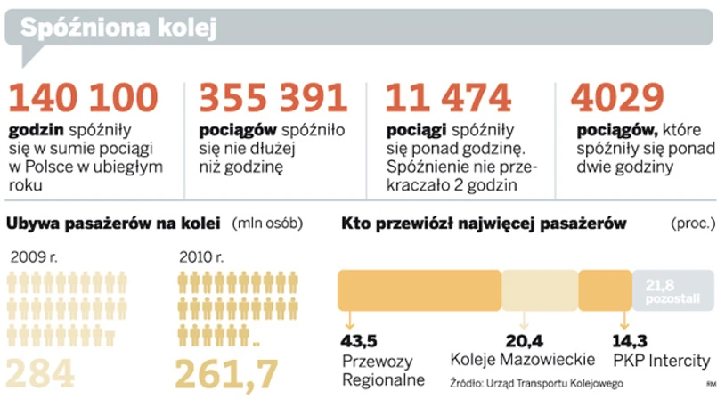 Na czas nie dojechały w ubiegłym roku 370 894 pociągi, czyli jedna czwarta wszystkich, jakie w tym czasie kursowały. W sumie przewoźnicy uruchomili w ubiegłym roku 1,468 mln pociągów, z czego 1,308 mln kursowało na trasach regionalnych, a 112,6 tys. na międzywojewódzkich i 47,5 tys. na międzynarodowych. Zdecydowana większość – ponad 370 tys. – była opóźniona nie więcej niż godzinę. Średnio każdy pociąg spóźnił się 22,6 minuty.