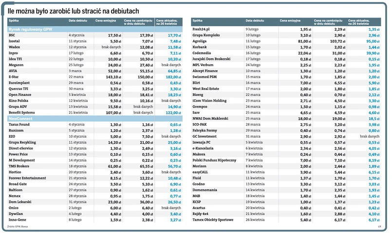 Inwestorzy, którzy sprzedali akcje debiutantów już podczas pierwszej sesji, mogli zarobić w przypadku 9 firm debiutujących na rynku regulowanym. Najwięcej w przypadku spółki Izostal, której walory podrożały z 5,50 do 7,07 zł za sztukę w dniu debiutu, czyli o ponad 20 proc. Duży zysk zanotowali też akcjonariusze Megaronu, którzy po zakupie PDA w ofercie pierwotnej poprzedzającej debiut zdecydowali się je sprzedać na pierwszej sesji. Podrożały one z 24 do ponad 27 zł. Stratę, i to minimalną, odnotowali akcjonariusze tylko jednej spółki – BSC Drukarni (jej akcje potaniały na debiucie z 17,50 do 17,39 zł).