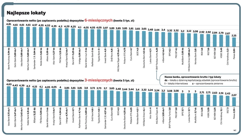 Na rynku są tylko 4 takie depozyty na 3 miesiące i 9 na pół roku. Najwyższe odsetki dają te instytucje finansowe, które dopiero budują swoją bazę depozytową, czyli Meritum, Santander i Bank Pocztowy oraz banki z grupy Leszka Czarneckiego, a więc Getin, Idea czy niedawno kupiony Allianz. Bank Pocztowy w ostatnim czasie zaproponował lokatę 6-miesięczną z dzienną kapitalizacją i oprocentowaniem nominalnym w wysokości 4,81 proc. (co można porównać z 5,8 proc. na depozycie podlegającym opodatkowaniu). Podwyżki na depozycie półrocznym wprowadził też Alior Bank, ale wzrost oprocentowania z 4 do 4,35 proc. pozwala jedynie uchronić oszczędności przed spadkiem wartości, nie gwarantując żadnego zysku. Nawet takiej ochrony nie dają natomiast nowe lokaty z dzienną kapitalizacją, które ostatnio wprowadziły do oferty mBank i MultiBank (Grupa BRE).