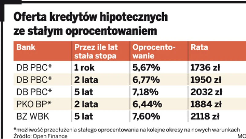 W PKO BP i w DB po okresie stałego oprocentowania klient musi się zdecydować, czy będzie spłacał pożyczkę według zmiennego oprocentowania, czy też zdecyduje się na stałe raty przez kolejny okres, ale już na nowych zasadach. W BZ WBK, który proponuje stałe oprocentowanie w wysokości 7,6 proc. przez 5 lat, nie ma możliwości uzyskania stałej stopy w kolejnym okresie.