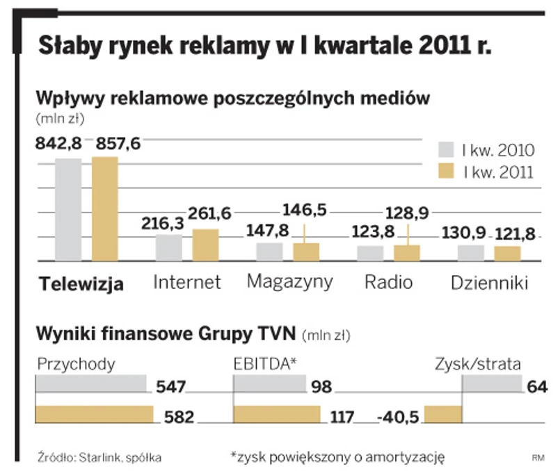 Obniżenie oczekiwań to efekt gorszej, niż oczekiwano, sytuacji na rynku w I kw. Analitycy domu mediowego Starlink oszacowali, że reklamodawcy wydali w telewizji tylko 1,8 proc. więcej niż przed rokiem, a wpływy głównych stacji (TVN, Polsatu i TVP) spadły o 1,3 proc. Znalazło to też odbicie w kwartalnych wynikach TVN. Podczas gdy zdaniem spółki wydatki na całym rynku reklamy telewizyjnej wzrosły o 1,5 proc., jej przychody w tym segmencie spadły. I to o 2,5 proc.