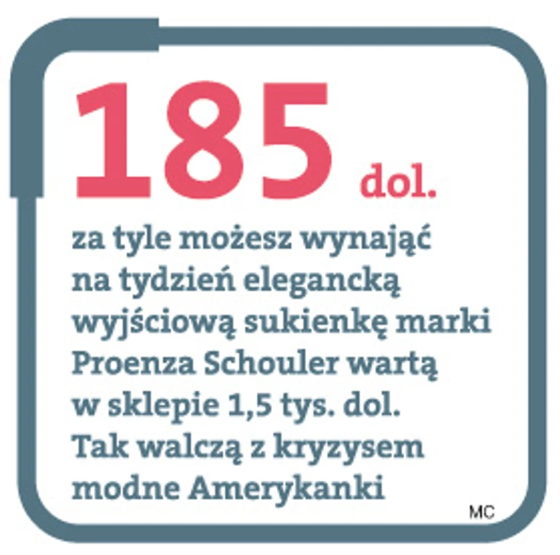 Jak donosi magazyn „New Yorker”, nawet mistrzowie konsumpcji – Amerykanie – przestawiają się na pożyczanie. Czasy i praca niepewne, ale żyć jakoś trzeba. Na przykład dobrze się ubrać. W pokryzysowym Nowym Jorku zaroiło się od wypożyczalni markowych strojów. Firmy takie jak Jack Silver Formal Wear czy Rent a Runaway (czyli „wynajmij sobie wybieg”) mają wszystko: od Oscara de la Renty przez Ralpha Laurena po Valentino. Chcesz pojawić się na imprezie czy balu charytatywnym (gdzie, jak wiadomo, ubija się najlepsze interesy) w sukience, która w sklepie kosztuje 1500 dol.? Nie ma problemu. Płacisz 185 dol. (łącznie z ubezpieczeniem) i dostajesz kreację na tydzień (plus buty). Firma przysyła ci nawet o numer większy duplikat stroju, gdyby ten pierwszy nie pasował. Hasło tych firm brzmi: każdy może się poczuć jak gwiazda filmowa bez niepotrzebnego obciążania karty kredytowej. Potrzebujesz biżuterii? Proszę bardzo. Naszyjnik dostępny w sklepie za 73,5 tys. dol. możesz wynająć już za 1,9 tys. Tak samo eleganckie płaszcze, szale czy torebki, które zazwyczaj widuje się tylko na czerwonym dywanie.