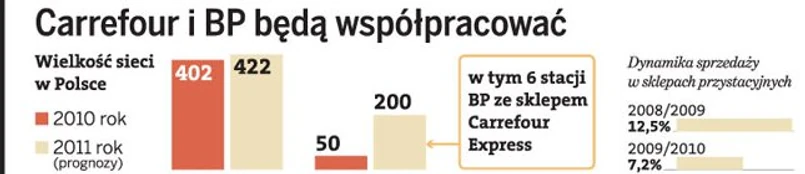 Sieć stacji BP podpisała porozumienie z francuską firmą handlową Carrefour o współpracy. Dzięki niemu na stacjach koncernu powstaną sklepy Carrefour Express, w których będzie można dokonywać zakupów na przykład w Trzech Króli.