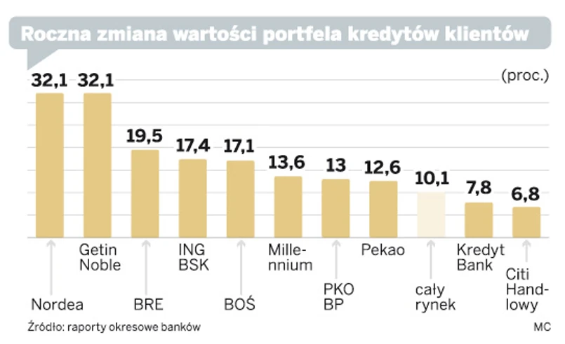 Co ciekawe, tylko kilka banków, które aktywnie powiększają swój portfel kredytowy, walczy również o depozyty. Najbardziej skuteczny jest Getin Noble Bank, w którym wielkość depozytów wzrosła o ok. 8 mld zł, czyli ponad jedną czwartą. Konkurencja mogłaby też pozazdrościć PKO BP, gdzie depozyty klientów wzrosły o ponad 13 proc. – Przed rokiem depozyty klientów indywidualnych w portfelach banków giełdowych wzrosły o 1,1 mld zł, tym razem od grudnia do marca przybyło ich mniej niż 0,45 mld zł. Klienci, którzy więcej pieniędzy do banków przynoszą, niż pożyczają, nie powinni sobie jednak już robić nadziei na wyższy zarobek – uważa Halina Kochalska z Open Finance.