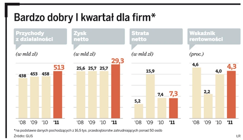 Coraz większy odsetek przedsiębiorstw z powodzeniem zarabia na swoje utrzymanie i na koniec roku może pochwalić się nadwyżką w firmowym budżecie. Co więcej systematycznie rośnie również poziom ich przychodów i zysków. Jak pokazują najnowsze dane Głównego Urzędu Statystycznego, spośród 16,5 tys. przebadanych przez niego przedsiębiorstw 61,6 proc. zamknęło pierwszy kwartał tego roku zyskiem – to o 1,4 proc. lepszy wynik niż przed rokiem. Wszyscy, którzy zyskali, w okresie od stycznia do końca marca zarobili łącznie na czysto niemal 29,3 mld złotych, czyli o 14 proc. więcej niż rok wcześniej, a nawet o 14 proc. więcej niż w pierwszym kwartale 2008 roku, czyli tuż przed nadejściem kryzysu.