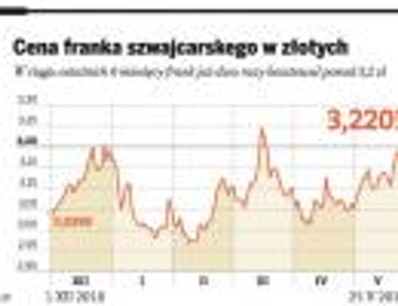 Szwajcarska waluta wzmocniła się wczoraj w stosunku do naszej o 1,57 proc., osiągając poziom 3,23 zł. – Na wyższym poziomie – 3,26 zł frank był ostatnio w połowie marca. Do szwajcarskiej waluty osłabiały się także euro (straciło wczoraj niemal 1 proc.) i dolar, który stracił 0,5 proc.