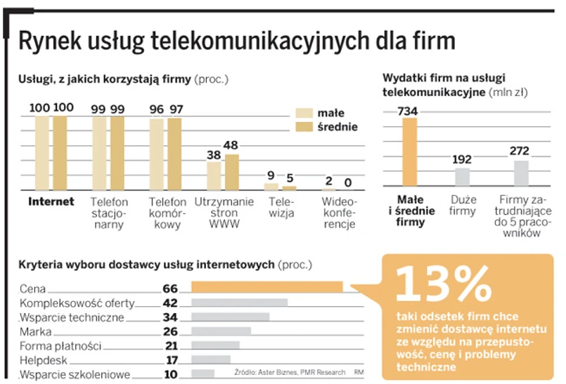 Na rynek mocno wchodzi też Aster Biznes należący do operatora kablowego Grupy Aster. Operator prześwietlił małe i średnie firmy (badania przeprowadził na jego zlecenie PMR Research). Z analiz wynika, że cena jest najważniejszym kryterium wyboru operatora dla 25 proc. firm; drugim wskaźnikiem jest kompleksowość oferty.