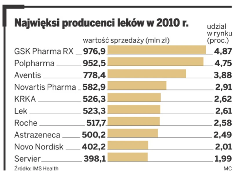 GSK Pharma RX sprzedał farmaceutyki za 977 mln zł. Druga pod względem wartości sprzedaży jest Polpharma – 953 mln zł, trzeci Aventis – 778 mln zł. Tak według IMS Health, firmy monitorującej branżę, wygląda ranking największych graczy na rynku leków pod względem wartości sprzedaży. Pierwsza trójka dystansuje resztę stawki. Kolejna piątka firm zanotowała przychody między 500 a 600 mln zł. To Novartis Pharma, KRKA, Lek, Roche i Astrazeneca.