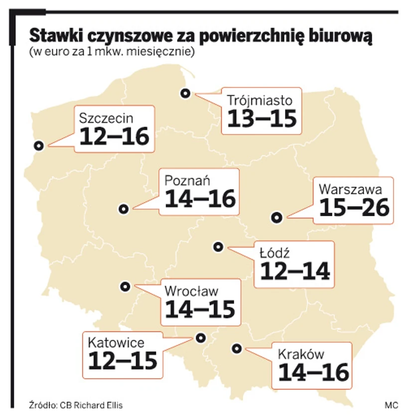 W efekcie w tym roku liczba niewynajętej powierzchni spadła w Warszawie do poziomu 6,6 proc. z ponad 7 proc. w centrum i nieco poniżej 6 proc. w lokalizacjach poza centrum miasta. – To z kolei doprowadziło do wzrostu cen. Koszt za mkw. miesięcznie skoczył z 24 do 26 euro – mówi Joanna Mroczek, dyrektor działu badań rynku i doradztwa w firmie CB Richard Ellis.