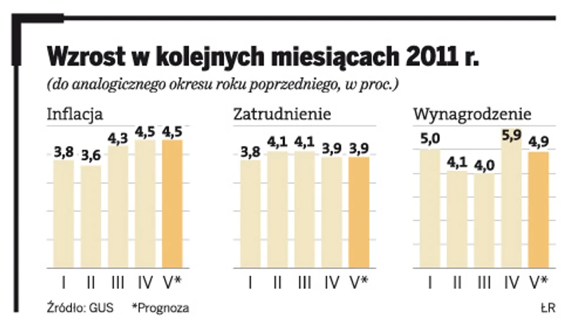 Inflacja w maju nie była niższa niż w kwietniu, kiedy to liczona rok do roku wyniosła 4,5 proc. – twierdzi zgodnie kilku ekonomistów z czołowych polskich instytucji finansowych, z którymi rozmawialiśmy. Zgadzają się oni też, że na podobnym poziomie jak w kwietniu wzrosło zatrudnienie – o 3,9 proc. Natomiast zdecydowanie dzieli ich opinia na temat wzrostu płac.