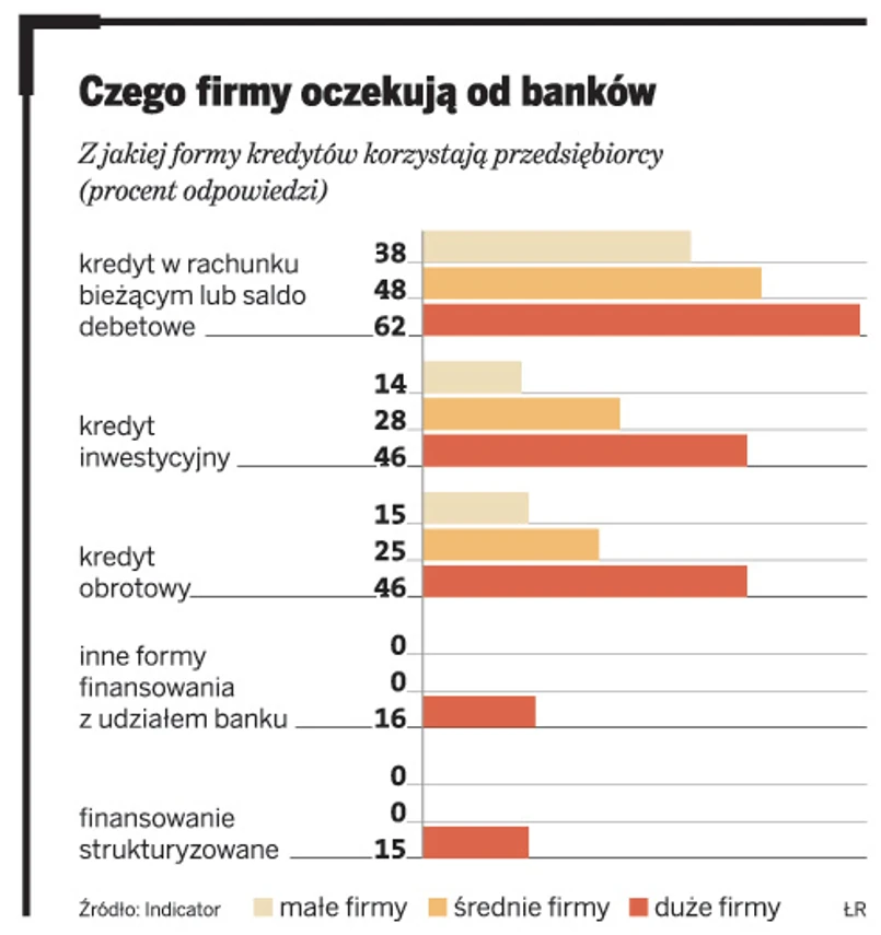 Jeśli firmy korzystają z finansowania z banku, to najczęściej wybierają kredyt w rachunku bieżącym lub saldo debetowe. Na takie rozwiązanie wskazało 62 proc. dużych firm, 48 proc. średnich i 38 proc. małych. Kredyt inwestycyjny czy obrotowy wybierają średnie i duże firmy.