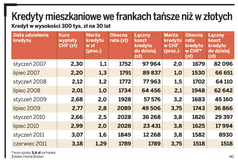 Jeszcze bardziej na korzyść kredytów walutowych przemawia zestawienie łącznych kosztów pożyczki od momentu jej udzielenia. Osoba, która na początku 2007 r. wzięła kredyt we frankach, do tej pory zapłaciła bankowi prawie 82 tys. zł. Tymczasem ktoś, kto wziął w tym samym czasie taką samą pożyczkę w złotych, zapłacił o prawie 16 tys. zł więcej. Nawet przy pożyczce walutowej wziętej przy kursie ok. 2 zł za franka (z lipca 2008 r.) łączny koszt zapłaconych rat jest o 2 tys. zł niższy niż w przypadku kredytu złotowego wziętego w tym samym czasie.
