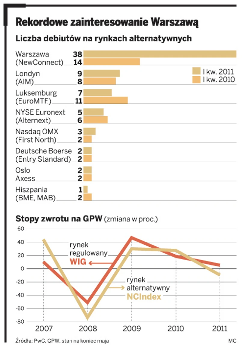W tej klasyfikacji bijemy już na głowę konkurencyjne rynki kapitałowe w Europie. W pierwszym kwartale tego roku debiutów mieliśmy 38 (rok wcześniej zaledwie 14). Daleko w tyle pozostał za nami rynek AIM w Londynie (dziewięć debiutów) czy EuroMTF w Luksemburgu (siedem). Eksperci są zgodni: stajemy się potęgą w kreowaniu nowych biznesów, które po okresie niemowlęctwa mają szansę stanąć na nogi.