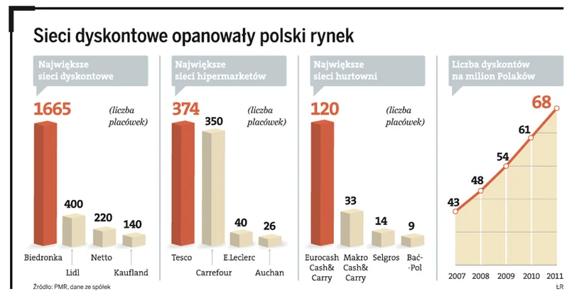 Na przykład największa sieć dyskontowa w Polsce, Biedronka, ma 1600 sklepów, gdy największa sieć hurtowni, Eurocash Cash & Carry – 120 placówek. Ubiegłoroczne obroty Biedronki przekroczyły 19 mld złotych, a w przypadku hurtownika było to około 3,5 mld złotych. Sieci dyskontowe są już tak silne, że otwierają własne centra dystrybucyjne, czyli de facto budują wewnętrzne hurtownie. Spółka Jeronimo Martins ma już dziewięć takich centrów.