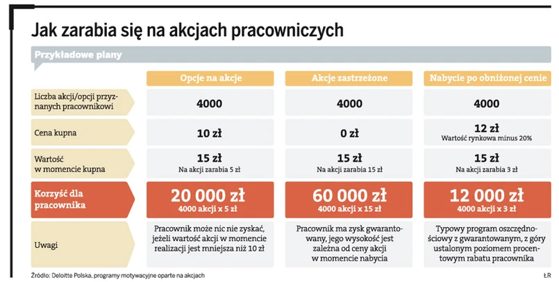 – Celem dobrze skonstruowanego planu akcyjnego jest nagrodzenie pracowników za już wykonaną pracę i motywacja do pracy w przyszłości – przekonuje Adam Mariuk z zespołu rozwiązań dla pracodawców Deloitte, który zajmuje się wdrażaniem tego rodzaju projektów. I dodaje, że w Polsce ten rynek nie jest jeszcze w pełni rozwinięty, co wynika ze stosunkowo krótkiego okresu funkcjonowania rynku kapitałowego w ogóle, jak również dużego przywiązania pracowników do wynagrodzenia pieniężnego.