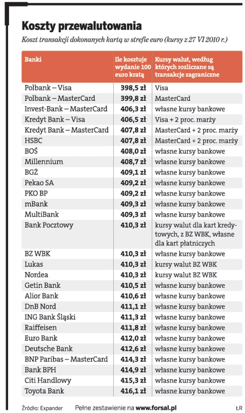 Warto sprawdzić też, jakie kursy stosuje przy przeliczeniach bank. Najbardziej korzystne są te, które używają Visa i MasterCard. Kilka banków stosuje je przy rozliczaniu transakcji międzynarodowych, to Kredyt Bank, HSBC i Polbank. Jednak tylko ten ostatni nie narzuca przy tym dodatkowej opłaty. – Rachunek w wysokości 100 euro płacony jego kartą kosztuje klienta mniej niż 400 zł. To koszt porównywalny z kupnem waluty w kantorze – mówi Jarosław Sadowski. W HSBC i KB trzeba zapłacić jeszcze marżę w wysokości 2 proc. wartości transakcji. Większość banków rozlicza zagraniczne transakcje kartowe za pomocą własnych kursów walut, które są wysokie, ale do których nie jest już doliczana żadna opłata. 100 euro zapłacone za granicą najczęściej kosztuje klienta 410 zł.