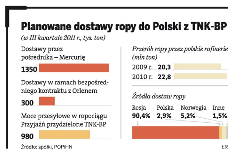 Jeszcze kilka dni temu spółki chwaliły się, że to pierwszy bezpośredni kontrakt. Wcześniej Orlen kupował ropę TNK-BP wyłącznie przez tzw. traderów, m.in. firmę Mercuria (dawne J&S). TNK-BP za jego pośrednictwem co kwartał eksportuje do Polski (do Orlenu i Lotosu) 1,35 mln ton ropy. Jonathan Kollek twierdzi, że dostawy realizowane przez Mercurię będą miały pierwszeństwo. Reszta, czyli bezpośredni kontrakt TNK-BP z Orlenem, to wielka niewiadoma.