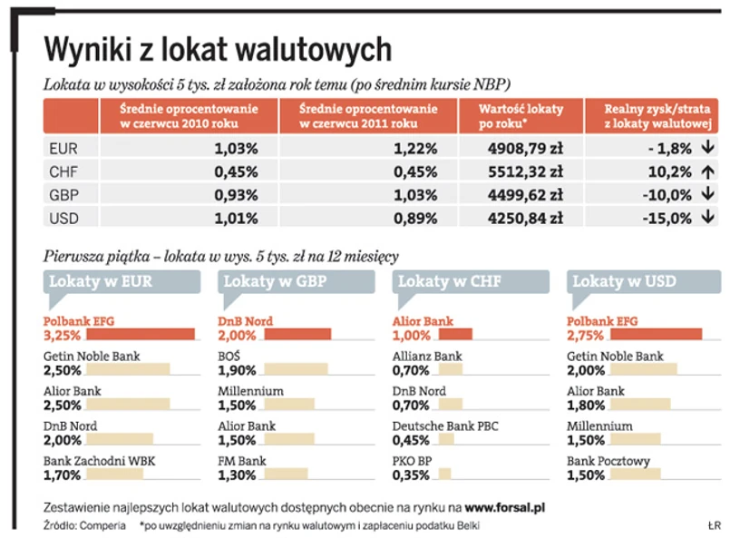 Depozyty w dolarach, euro i funtach na minusie. Tylko frank w ciągu roku wyszedł na plus, ale to zasługa wzrostu jego wartości, a nie oprocentowania
