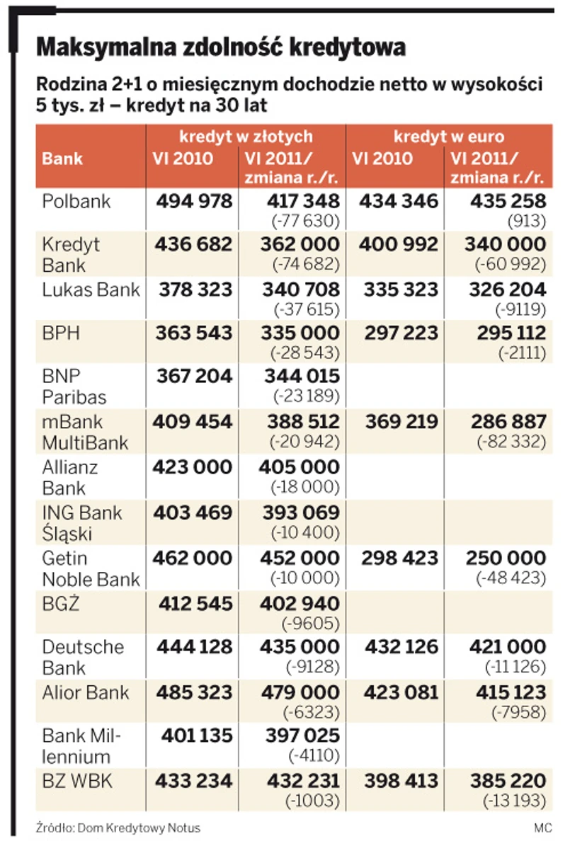 Jeszcze mniejszy kredyt złotowy można dostać w BPH, Lukas Banku i BNP Paribas. Maksymalna kwota pożyczki dla przeciętnej rodziny wynosi w nich 335 – 344 tys. zł. W większości banków spadek maksymalnej zdolności kredytowej w porównaniu z ubiegłym rokiem nie przekracza kilku, kilkunastu tysięcy złotych.