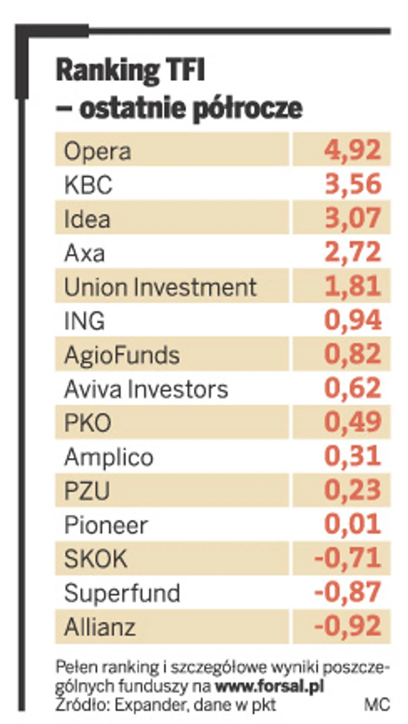 Z naszego rankingu wynika, że w takiej sytuacji rynkowej najlepiej aktywami klientów zarządzało TFI Opera. – Najwyższe miejsce w rankingu to głównie zasługa poprawy notowań funduszy Novo, czyli podmiotów, które zostały przejęte przez Operę od likwidowanego SEB TFI – mówi Rafał Lerski.