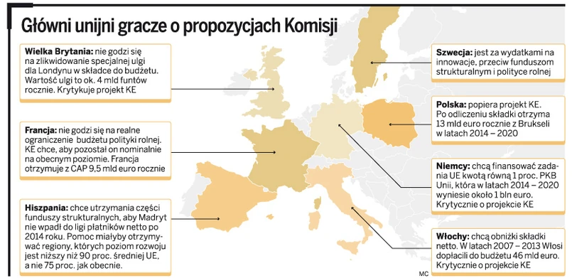 Pewne cięcia będą konieczne, bo zależy na nich największym płatnikom netto, zwłaszcza Wielkiej Brytanii, Holandii, Danii, Szwecji. Jednak z pewnością Polska nie otrzyma na pomoc strukturalną mniej niż w obecnym budżecie (68 mld euro). Polska w Brukseli od dawna wyrobiła sobie opinię niezwykle twardego, wręcz egoistycznego negocjatora. Z pewnością za premierem Tuskiem staną wszystkie nowe kraje członkowskie, które takich możliwości negocjacyjnych nie mają. Sojusznikiem Polski będą też Grecja i Portugalia, którym podobają się zapisy o zwiększeniu współczynnika finansowania z funduszy strukturalnych dla krajów, które przeżywają kryzys. Bardziej dwuznaczne jest natomiast stanowisko Hiszpanii, która w nowym budżecie po raz pierwszy stanie się płatnikiem netto.