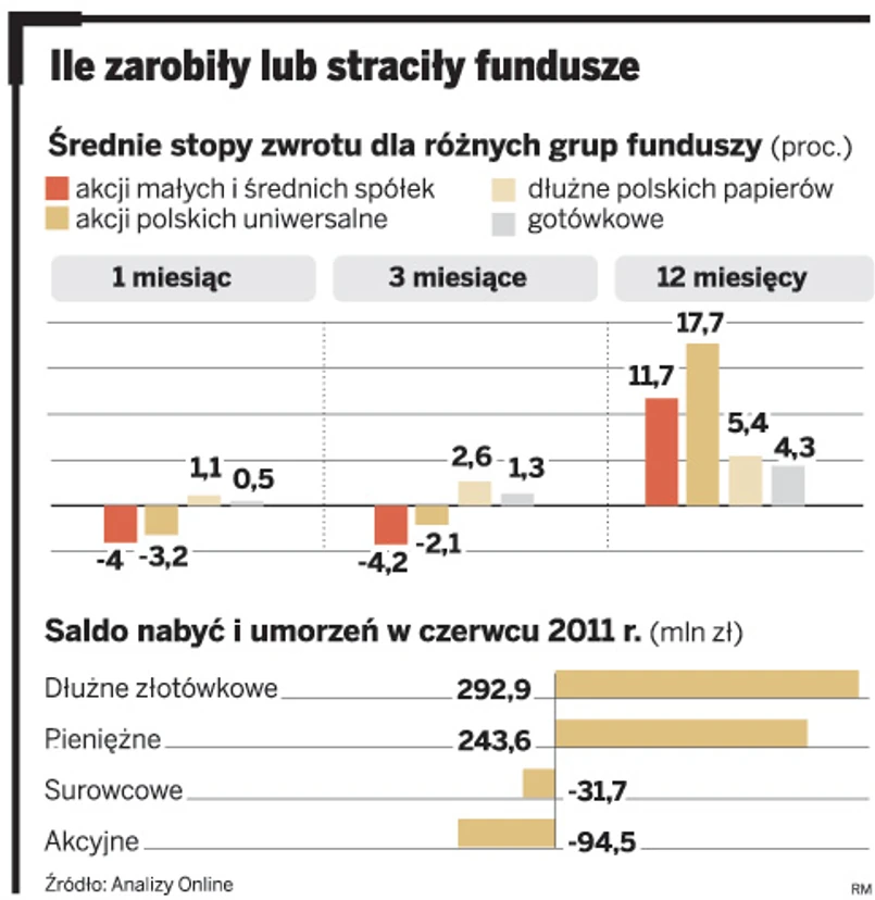 Pierwsze symptomy poprawy wyników tej grupy funduszy mieliśmy w minionym miesiącu. W czerwcu zarobiły one dla swoich klientów średnio 1,1 proc. To najwięcej spośród wszystkich grup polskich funduszy. Dla przykładu podmioty akcji małych i średnich spółek straciły 4 proc., fundusze akcji szerokiego rynku były 3,2 proc. pod kreską, a gotówkowe zarobiły 0,5 proc.