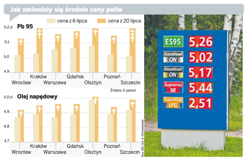 Najwięcej, bo o kilkanaście groszy, skoczyły ceny benzyny – z niewiele ponad 5 zł za litr do 5,20 zł. Z kolei ceny oleju napędowego poszły w górę o ponad 1 proc., do blisko 5 zł/l. A to nie koniec. – Ceny będą rosnąć, możliwe, że nawet do końca wakacji – tłumaczą analitycy firmy analitycznej e-petrol.